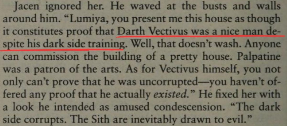 Same conversation, same source: Betrayal gives an actual explanation for why he’s supposedly different. When Jacen asks how he avoided being “ruined” by greed, Brisha’s answer isn’t “because he was secretly nice.” It’s that Vectivus already had a strong ethical center before he ever started pulling on the dark side.