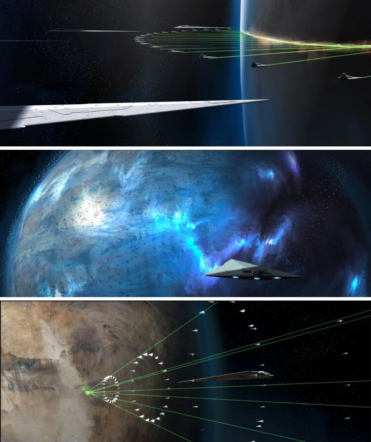 In development, these Star Destroyers weren’t just part of a fleet, they were planet killers. The concept art shows them gathering in formation around a planet, each one equipped with a superlaser capable of wiping out entire worlds. It’s a chilling image, and one that echoes the Empire’s obsession with superweapons, something fans of the Thrawn novels will recognize as a fatal flaw. The Empire poured resources into two Death Stars, only to lose both in a single day. The Final Order was meant to be a terrifying evolution of that legacy.