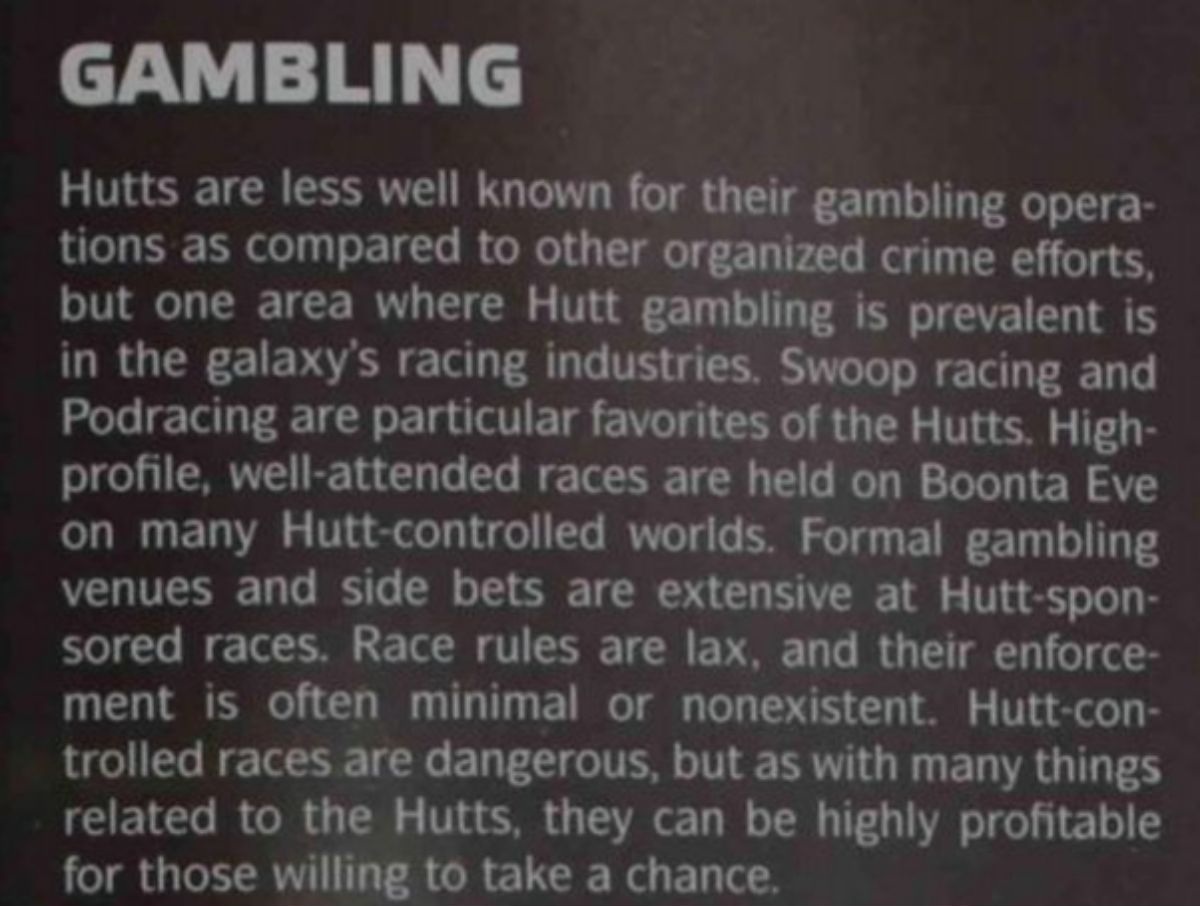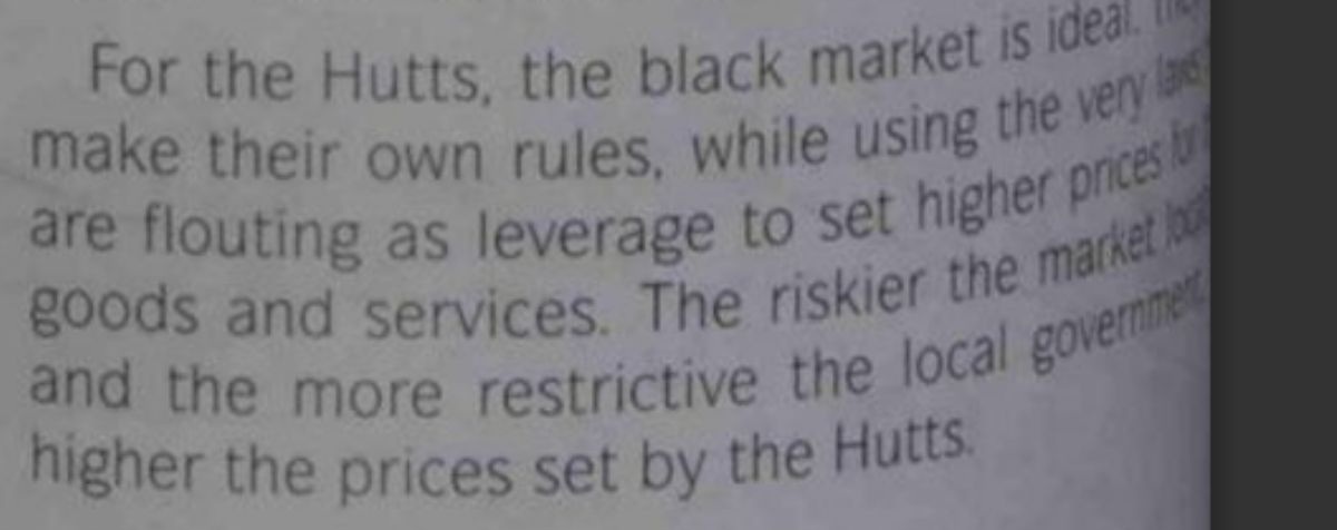 One Hutt source on their economics describes the black market as basically perfect for them: they get to make their own rules, and then use the very laws they’re breaking as an excuse to charge more. The riskier the trade looks and the tighter the local government tries to clamp down, the higher the prices the Hutts can demand. It’s a business model built on scarcity, fear, and desperation.