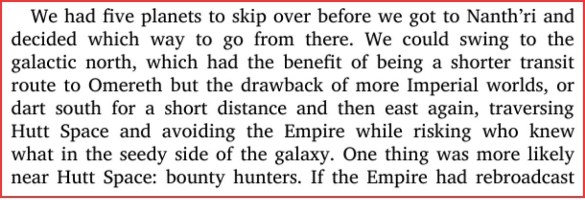 One of the nastiest things the Hutts do on a daily basis isn’t just running individual crimes, it’s running the places where crime can breathe. In Heir to the Jedi, when Luke and Nakari plan their route to Omereth, they have two options: fly north through more Imperial worlds, or cut south and “traverse Hutt Space and avoid the Empire while risking who knew what in the seedy side of the galaxy.” Luke immediately notes that “one thing was more likely near Hutt Space: bounty hunters.” That’s the reputation Hutt territory has in canon: it’s where you go to slip out from under Imperial control, and where the galaxy’s criminals, hunters, and smugglers can operate with a lot more freedom than they’d ever get under direct Imperial rule.