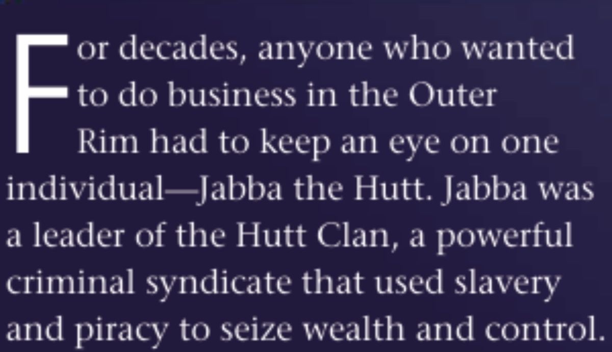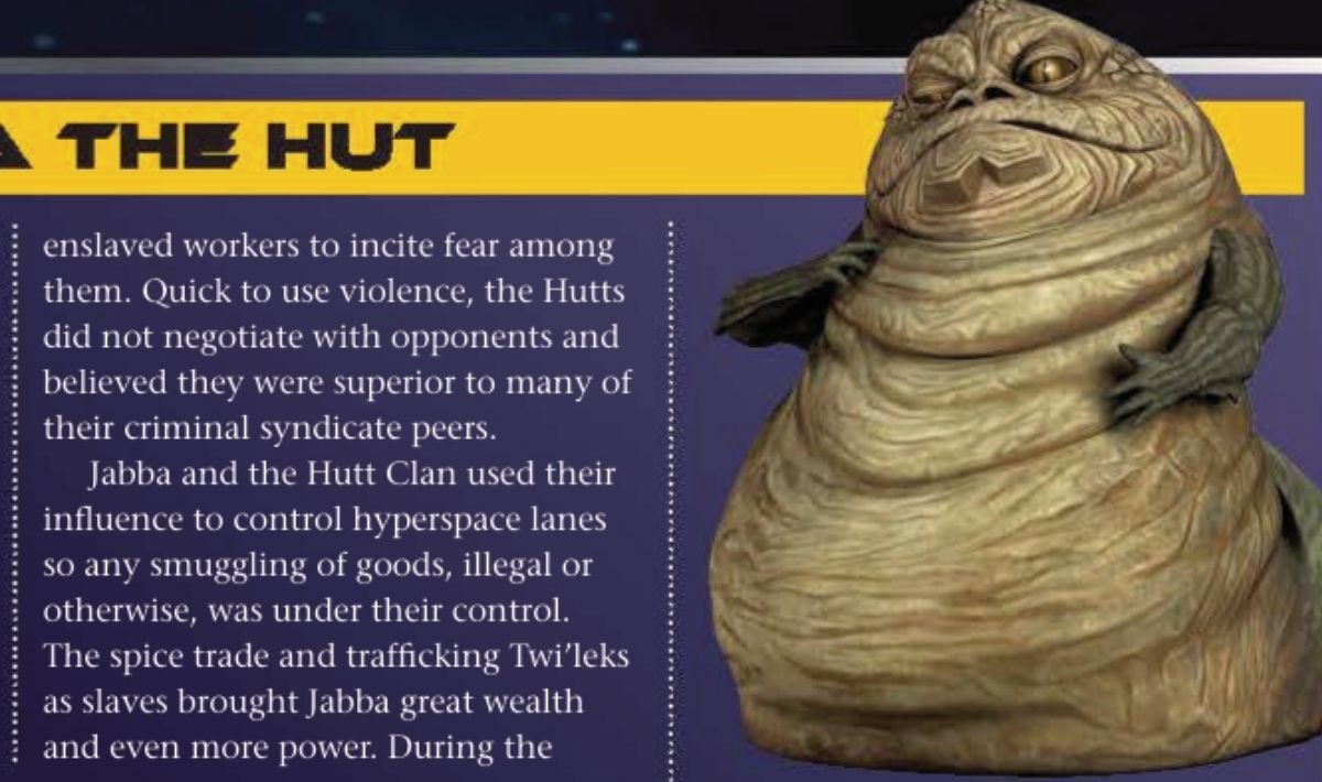 If you strip everything else away, the Hutts are slavers first and crime lords second. Star Wars Insider #224 describes Jabba as a leader of the Hutt Clan, “a powerful criminal syndicate that used slavery and piracy to seize wealth and control.” It even singles out that trafficking Twi’leks as slaves “brought Jabba great wealth” and more power. Put together, it makes slavery look like the foundation of his kajidic, not a side crime, but the core of the business.