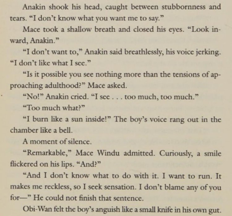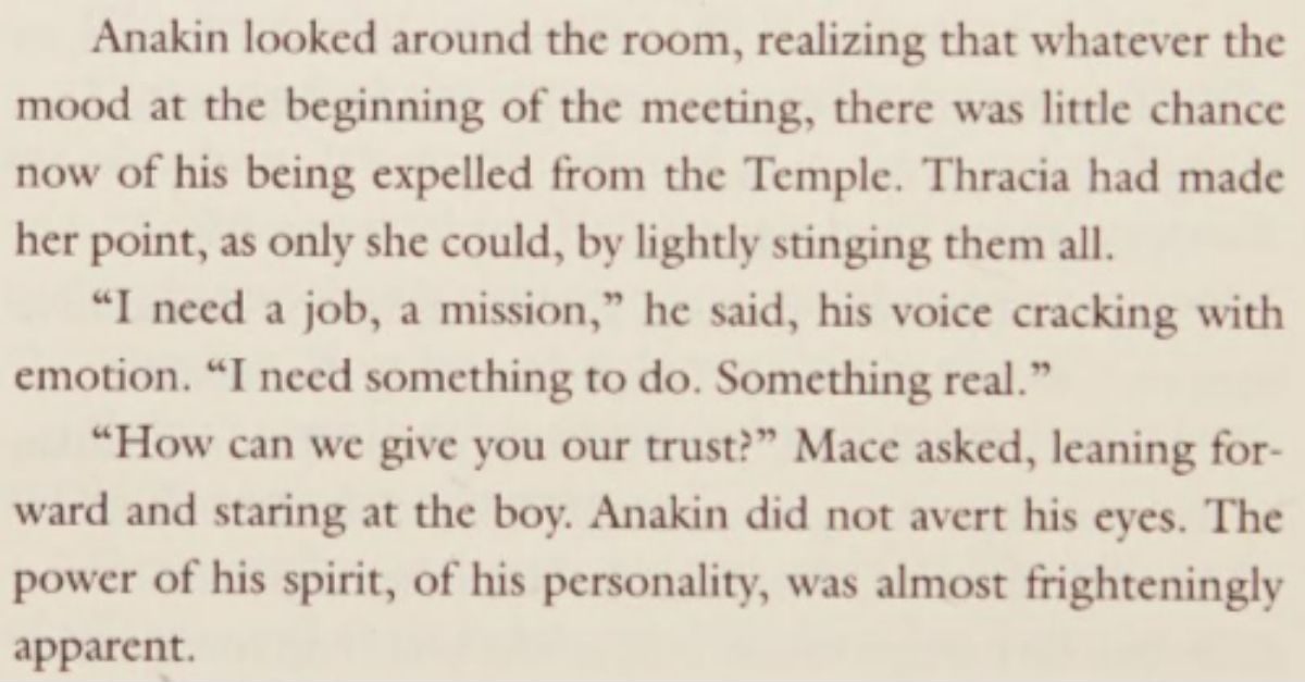 On top of that, he doesn’t fully trust why the Order keeps him around. In his quieter moments in the Temple, Anakin wonders if they actually want him, or if they’re just curious about his power and the prophecy attached to him. He compares himself to someone who’s rich but never sure if they have real friends, only people who want what they have. For Anakin, that “wealth” is his connection to the Force. That’s not a great mental place for a twelve-year-old to be in, especially one who’s supposed to be learning trust and serenity.
