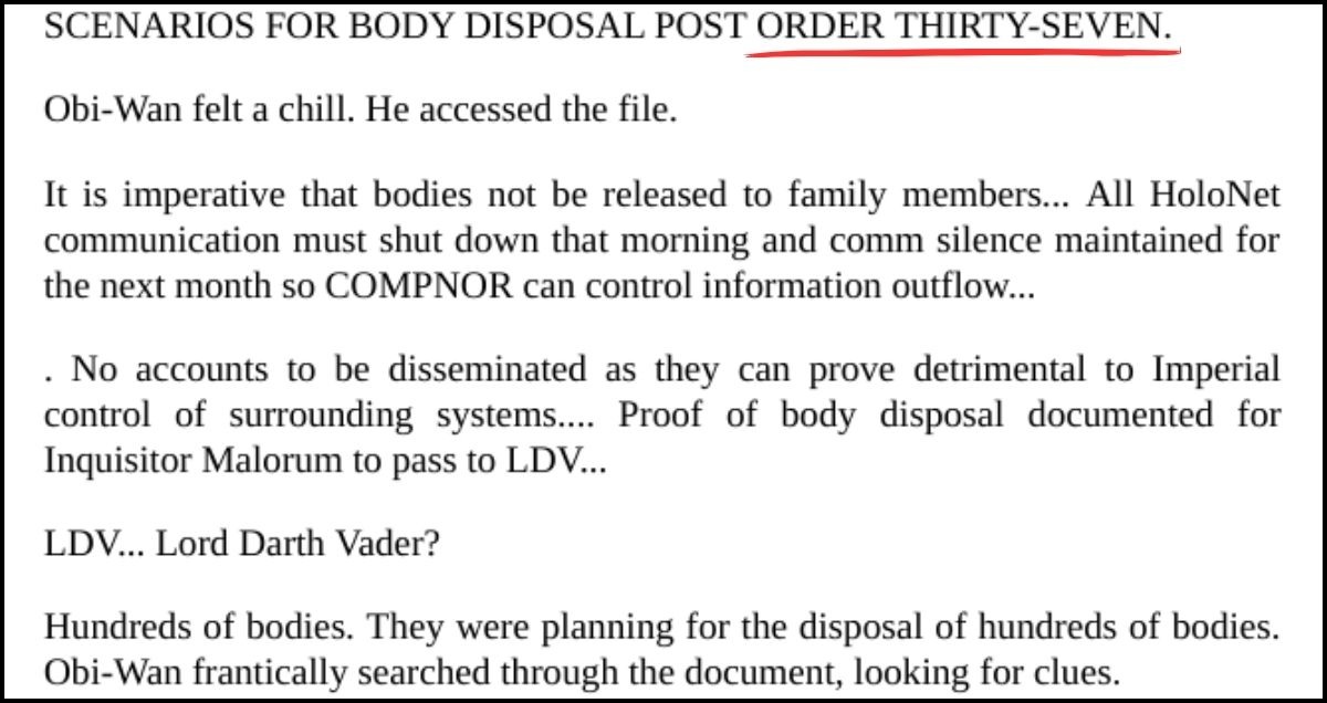 “It is imperative that bodies not be released to family members… All HoloNet communication must shut down that morning and comm silence maintained for the next month so COMPNOR can control information outflow… No accounts to be disseminated as they can prove detrimental to Imperial control of surrounding systems… Proof of body disposal documented for Inquisitor Malorum to pass to LDV.”