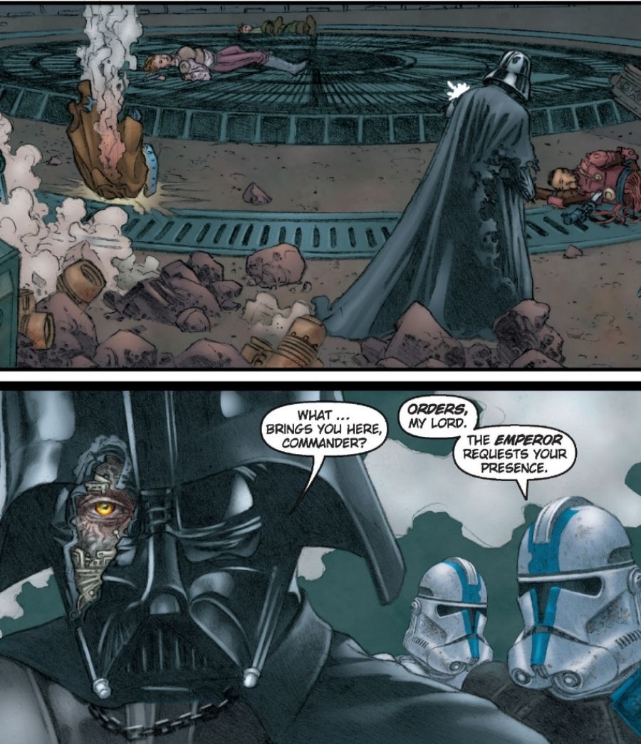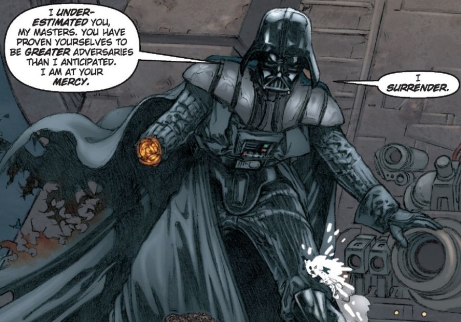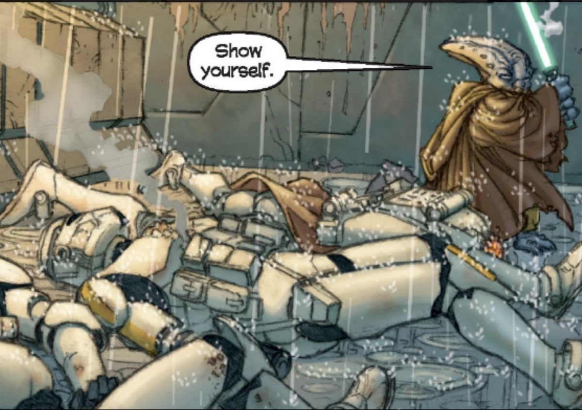 The three surviving Jedi rally and hurl debris at Vader through the Force, nearly overwhelming him. Tsui Choi finally decides that Vader has to be finished off, but before he can act, a group of stormtroopers arrives and opens fire. Jastus Farr is struck and falls to his death, while Choi holds off the troopers long enough to give Darté a chance to escape. But Vader’s interference ruins that chance as well, and the last two Jedi are ultimately gunned down in the barrage.