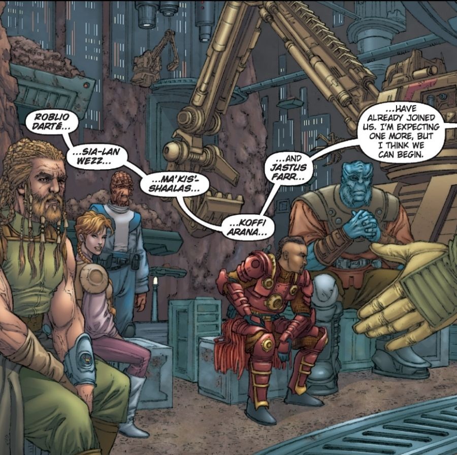 The Jedi gathering was called by Shadday Potkin. When Bultar and Tsui arrive, the number of Jedi present rises to eight. Together, they debate what should be done about the Empire and the destruction of the Jedi Order, with Koffi Arana even suggesting that they should turn to the dark side in order to defeat Vader. But before they can settle on a plan, the group senses a dark presence approaching. It is Darth Vader.