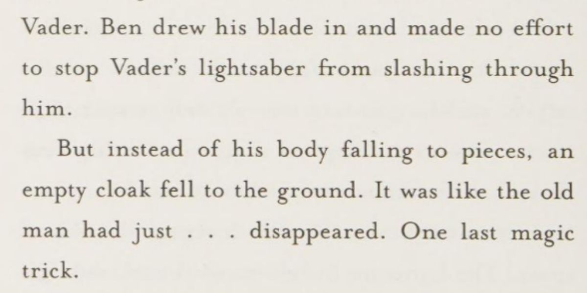 In The Princess, the Scoundrel, and the Farm Boy, the scene is described from Han’s point of view. Ben notices the troopers, looks past them toward Luke, and seems to give one final nod before turning back to face Vader. Then comes the key detail: Ben makes no effort to block the strike, and instead of his body falling, “an empty cloak fell to the ground.” The passage even describes it like he had just “disappeared,” almost as if Obi-Wan chose that exact moment to ascend into the Force.