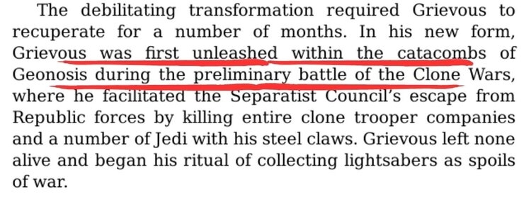 Peña’s piece gives the straightforward version. After his “resurrection” as a cyborg under Separatist control, Grievous isn’t introduced with a slow ramp-up. In his new body, he is first unleashed on Geonosis, not on some obscure later battlefield. Peña writes that Grievous was deployed “within the catacombs of Geonosis during the preliminary battle of the Clone Wars,” where he facilitated the Separatist Council’s escape from Republic forces by killing entire clone trooper companies and a number of Jedi with his steel claws. None of his victims survived, and he began his ritual of collecting Jedi lightsabers as trophies there, beneath the sand.