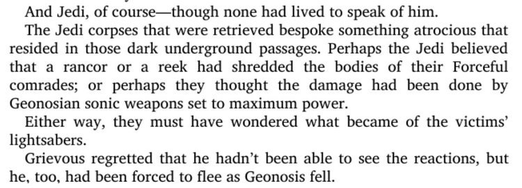 Luceno adds texture to that. Grievous thinks back and half-wonders how many clones he killed or maimed in those corridors, then almost casually adds, “And Jedi, of course—though none had lived to speak of him.” The Jedi corpses that are recovered later are in such a state that the Order can only guess what tore them apart. Maybe a rancor in the tunnels, maybe a reek, maybe Geonosian sonic weapons at full power. Whatever they think, they don’t connect it to a named enemy. Their fallen comrades’ lightsabers are simply missing. Those blades are already hanging at Grievous’s belt.