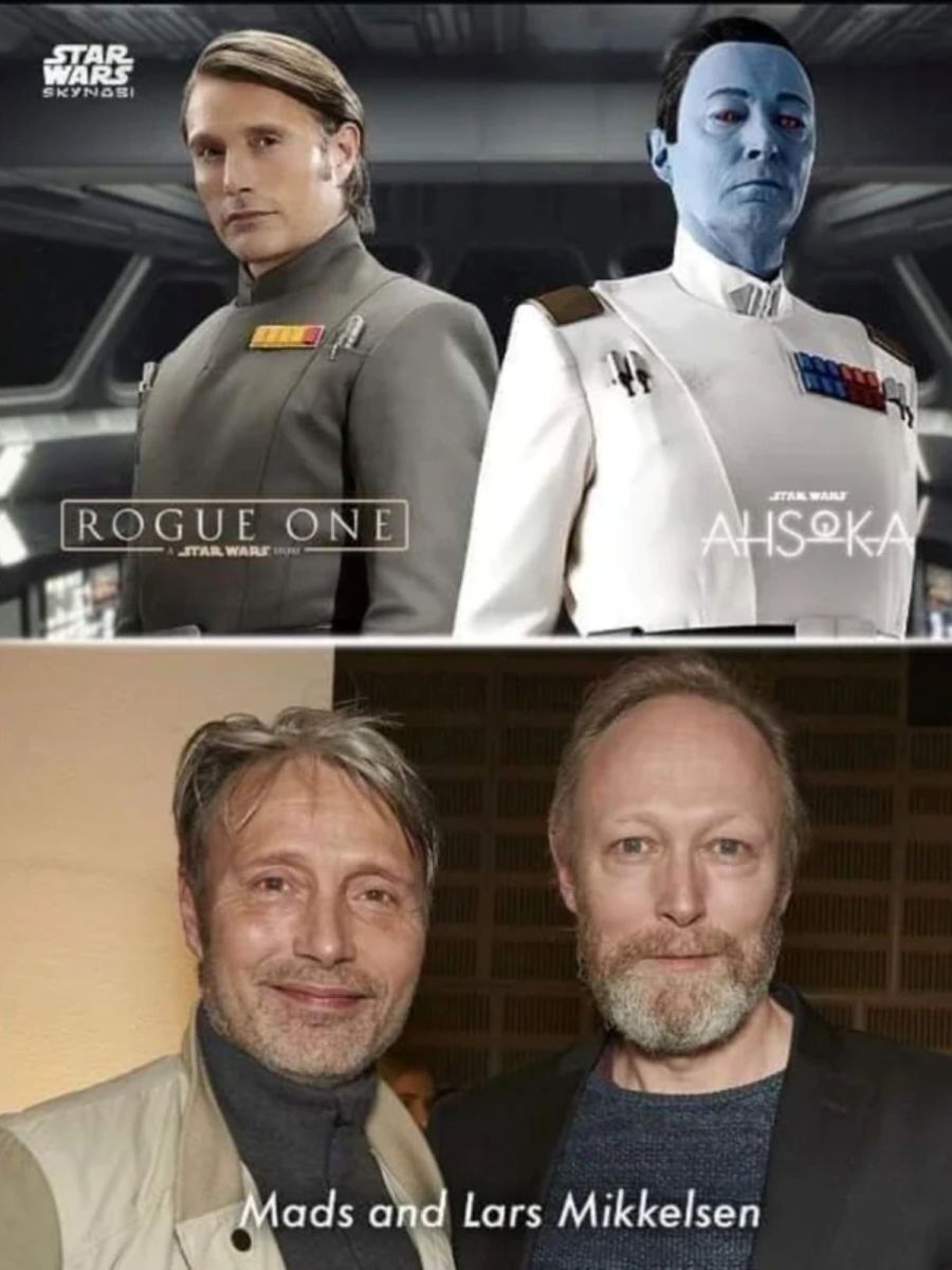 You might not realize it at first, but Grand Admiral Thrawn from Ahsoka and Galen Erso from Rogue One are actually played by brothers. Lars Mikkelsen brings Thrawn’s calm, calculating presence to life in live action, while Mads Mikkelsen gave us the tragic brilliance of Galen, the man behind the Death Star’s secret flaw. Two brothers — both shaping the fate of the galaxy, just on opposite sides of it.