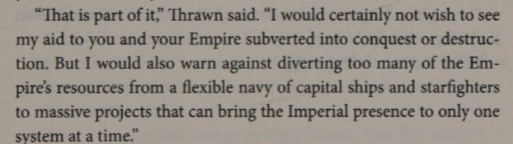 “I would certainly not wish to see my aid to you and your Empire subverted into conquest and destruction. But I would also warn against diverting too many of the Empire’s resources from a flexible navy of capital ships and starfighters to massive projects that can bring the Imperial presence to only one system at a time.”
