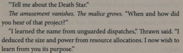 In the book, we see Thrawn questioning Palpatine about the secret Death Star project. The Emperor immediately challenges him, asking how he even learned of its existence.