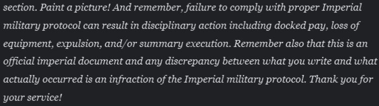 The story also reinforces how severe Imperial discipline could be. Failure to comply with protocol didn’t just risk docked pay. Penalties could include loss of equipment, expulsion from service, or even summary execution. The emphasis isn’t on fairness or due process, but on total adherence to regulations. Even written reports were treated as official Imperial documents, and discrepancies between what was reported and what actually occurred were considered infractions.