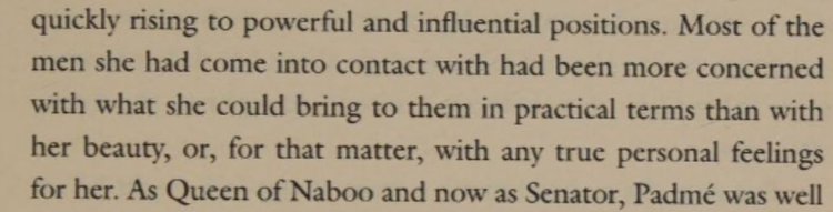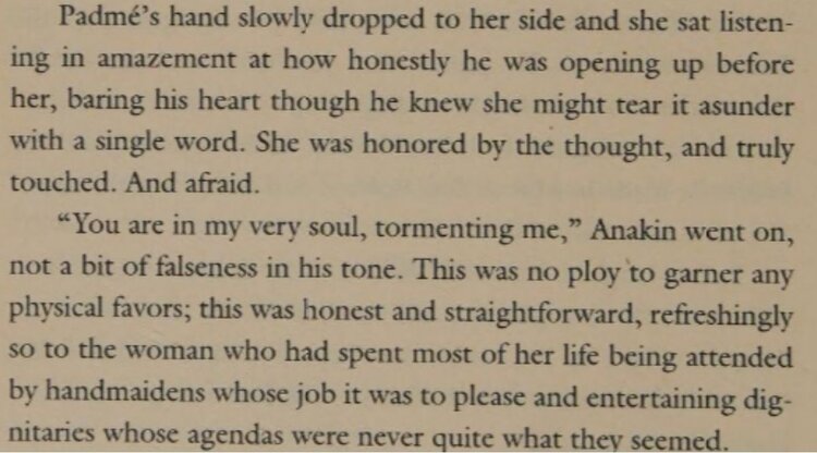 “Padmé’s hand slowly dropped to her side and she sat listening in amazement at how honestly he was opening up before her, baring his heart though he knew she might tear it asunder with a single word. She was honored by the thought, and truly touched. And afraid.