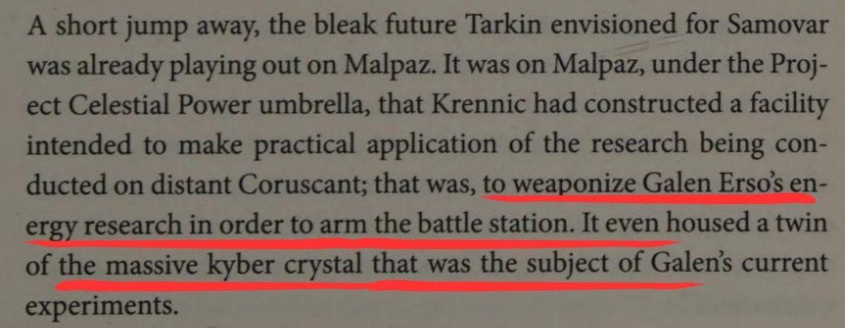 “A short jump away, the bleak future Tarkin envisioned for Samovar was already playing out on Malpaz. It was on Malpaz, under the Project Celestial Power umbrella, that Krennic had constructed a facility intended to make practical application of the research being conducted on distant Coruscant; that was,to weaponize Galen Erso’s energy research in order to arm the battle station.”