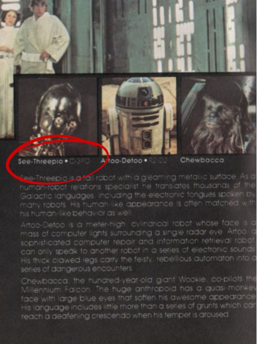 There is also older supporting evidence in early Star Wars print material. In the 1979 paperback novelization, an inset featuring film stills and short character bios lists Threepio’s designation as “C-3PO” with the letter O, not a zero. So this is not just the spelling used by modern official sources. It was already there in early published material tied directly to the original film.