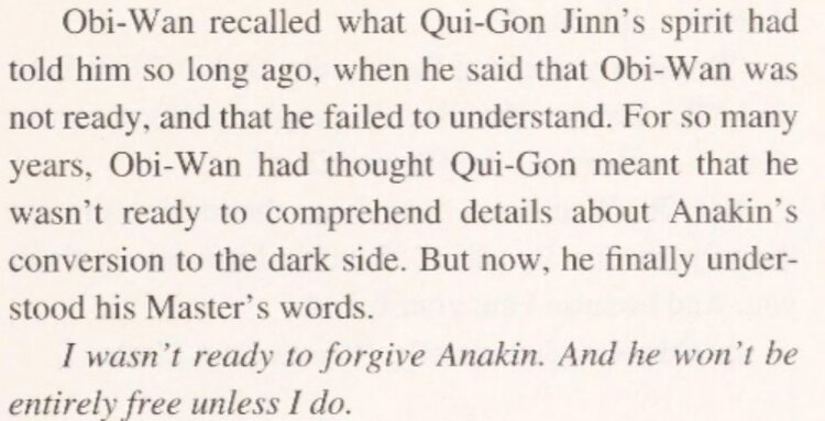 “Obi-Wan recalled what Qui-Gon Jinn’s spirit had told him so long ago, when he said that Obi-Wan was not ready, and that he failed to understand. For so many years, Obi-Wan had thought Qui-Gon meant that he wasn’t ready to comprehend details about Anakin’s conversion to the dark side. But now, he finally understood his Master’s words.”