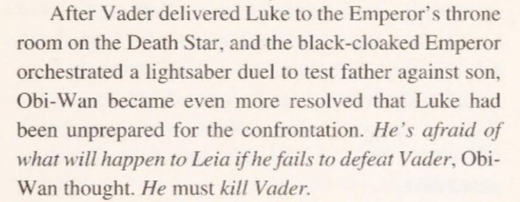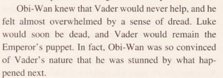 “Obi-Wan knew that Vader would never help, and he felt almost overwhelmed by a sense of dread. Luke would soon be dead, and Vader would remain the Emperor’s puppet. In fact, Obi-Wan was so convinced of Vader’s nature that he was stunned by what happened next.”