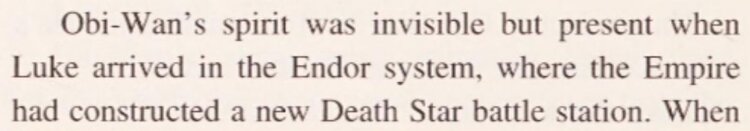“Obi-Wan’s spirit was invisible but present when Luke arrived in the Endor system, where the Empire had constructed a new Death Star battle station.”