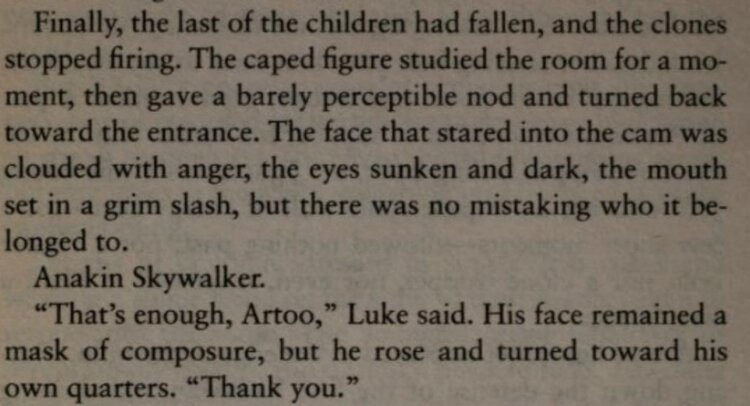 A Jedi Master steps in to defend them and is cut down by a figure in a dark cloak with a blue blade. He lets the clones move past him and continue the work. When he finally turns toward the security pickup, Luke sees his face clearly: Anakin Skywalker, leading the clones into the Temple.