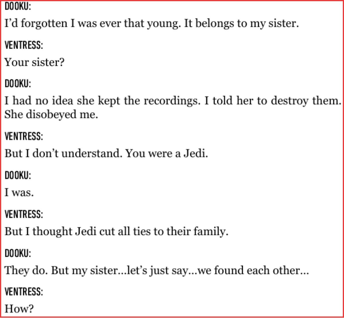 Not long after he arrives at the Temple, Dooku receives a wooden box sealed with the crest of Serenno. Inside is a small holoprojector and a message from his sister, Jenza. The two of them start talking again, and in the script he openly admits that they “communicated for years, sending messages back and forth across the stars,” all while he’s supposed to be cutting ties with his family.