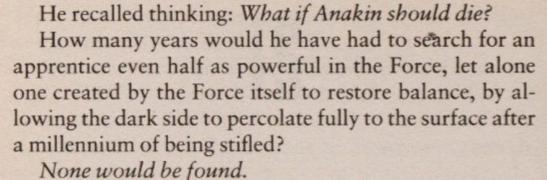 “He recalled thinking: What if Anakin should die? How many years would he have had to search for an apprentice even half as powerful in the Force, let alone one created by the Force itself to restore balance, by allowing the dark side to percolate fully to the surface after a millennium of being stifled? None would be found.”