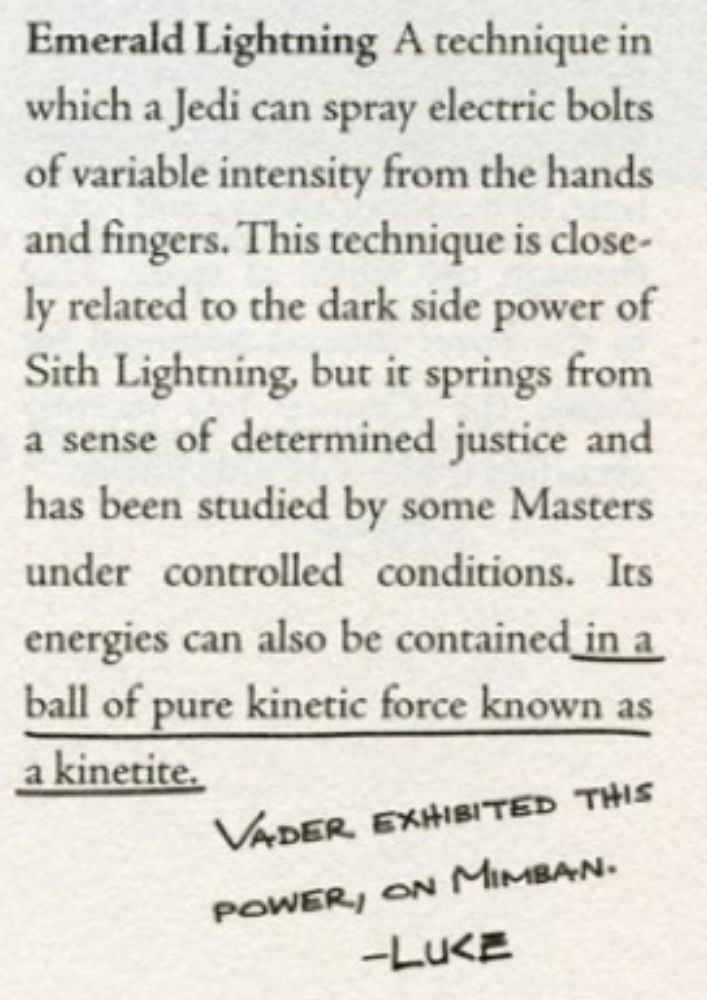 As noted in The Jedi Path, the ability, also called Emerald Lightning, was described as “a technique in which a Jedi can spray electric bolts of variable intensity from the hands and fingers. This technique is closely related to the dark side power of Sith Lightning, but it springs from a sense of determined justice.”