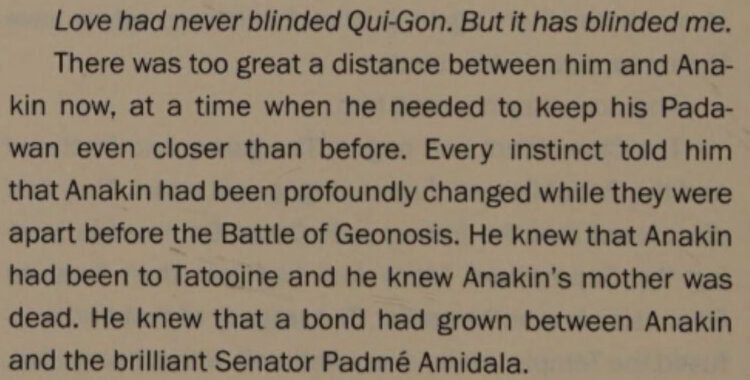 “Every instinct told him that Anakin had been profoundly changed while they were apart before the Battle of Geonosis. He knew that Anakin had been to Tatooine and he knew Anakin’s mother was dead. He knew that a bond had grown between Anakin and the brilliant Senator Padmé Amidala.”