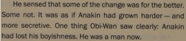“He sensed that some of the change was for the better. Some not. It was as if Anakin had grown harder — and more secretive. One thing Obi-Wan saw clearly: Anakin had lost his boyishness. He was a man now.”