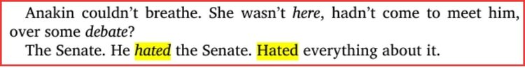 What Anakin is responding to is not simply appearance, but behavior. In these moments, Padmé leads with diplomacy, patience, and procedure. She argues for petitions, peace talks, and constitutional limits, all of which place her firmly within the political system Anakin already distrusts. As the novel later makes clear, that distrust is not subtle: “The Senate. He hated the Senate. Hated everything about it.”