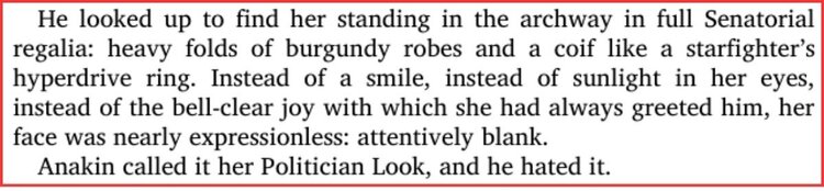 The novel reinforces that this reaction isn’t isolated. Later, when Anakin watches Padmé operate openly as a senator, speaking in debates and negotiations, the narration again frames her in explicitly political terms. She is described as speaking in her “Politician Voice” and wearing her “Politician Look,” fully immersed in her public role while Anakin observes from the side.