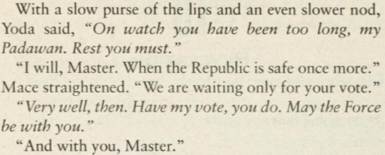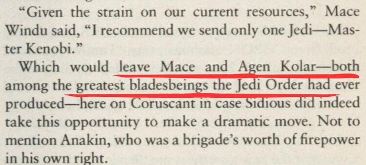“Which would leave Mace and Agen Kolar, both among the greatest bladesbeings the Jedi Order had ever produced, here on Coruscant in case Sidious did indeed take this opportunity to make a dramatic move.”