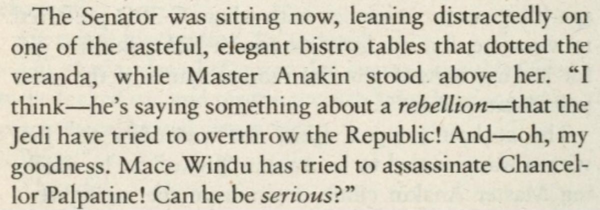 “The Senator was sitting now, leaning distractedly on one of the tasteful, elegant bistro tables that dotted the veranda, while Master Anakin stood above her. ‘I think he’s saying something about rebellion—that the Jedi have tried to overthrow the Republic! And—oh, my goodness, Mace Windu has tried to assassinate Chancellor Palpatine! Can he be serious?’”