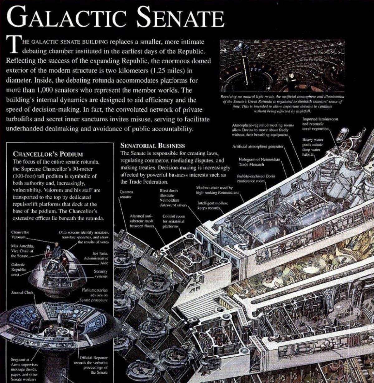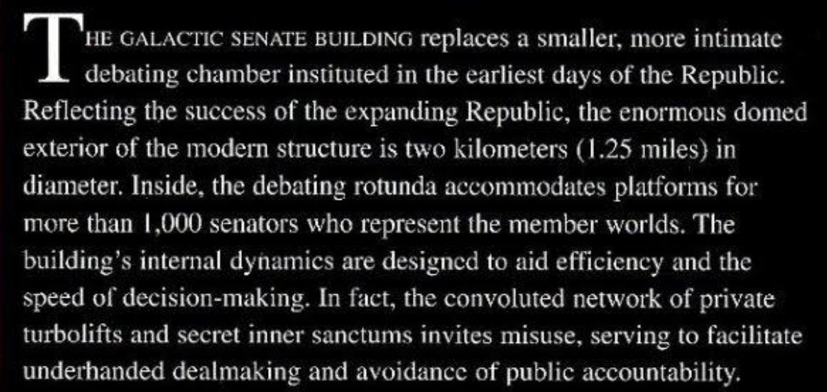 Reference material adds even more scale to that. The modern Galactic Senate Building replaced an earlier, smaller debating chamber from the Republic’s earliest days, and its domed exterior measured roughly two kilometers (1.25 miles) in diameter. Inside, the debating rotunda was designed to accommodate platforms for more than 1,000 senators representing the Republic’s member worlds. The building’s internal layout was also meant to speed up decision-making, though that same design included private turbolifts and hidden inner sanctums that made it easier for secret deals and political maneuvering to happen out of public view.