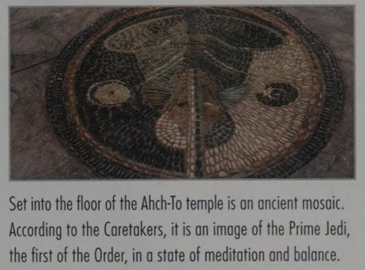 The book describes it like this: “Set into the floor of the Ahch-To temple is an ancient mosaic. According to the Caretakers, it is an image of the Prime Jedi, the first of the Order, in a state of meditation and balance.”