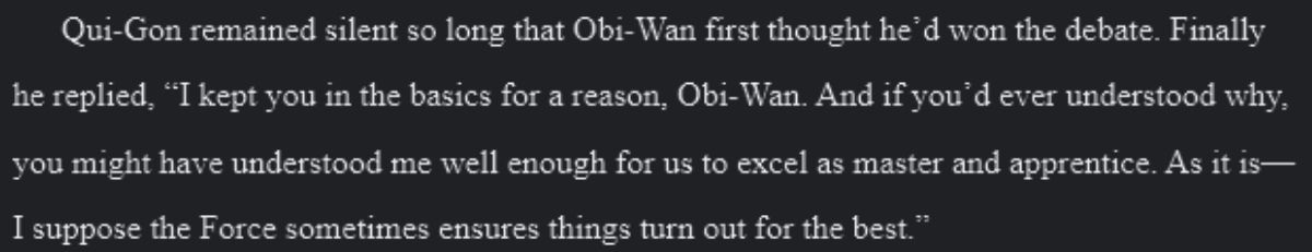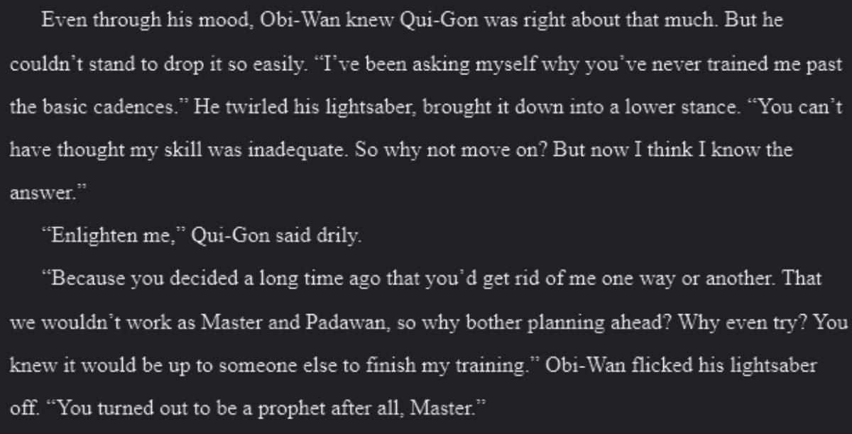 “I’ve been asking myself why you’ve never trained me past the basic cadences… You can’t have thought my skill was inadequate. So why not move on?” From Obi-Wan’s point of view, you only do that if you’re not invested in your student’s future.
