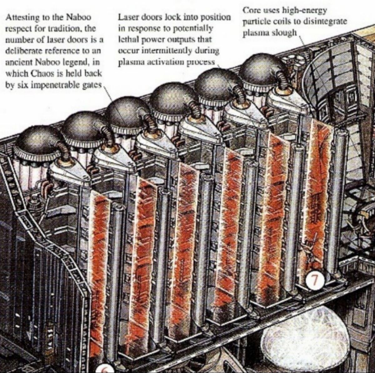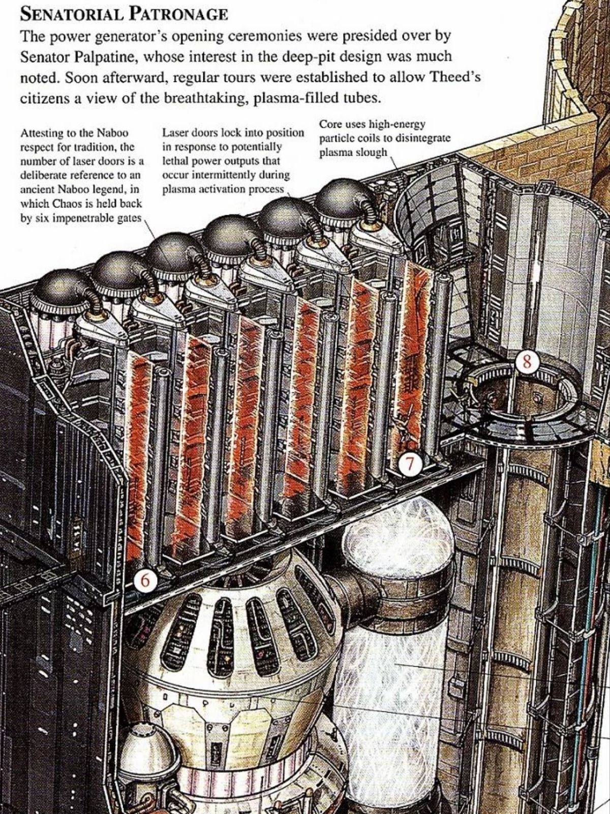 Inside the Theed power generator, the core isn’t running like a quiet engine that just hums in the background. The book points out that the system has power outputs that can turn lethal, and those spikes happen intermittently during the plasma activation process, not as a one-time event, but as part of how the generator cycles. When those bursts hit, the laser doors lock into position automatically.