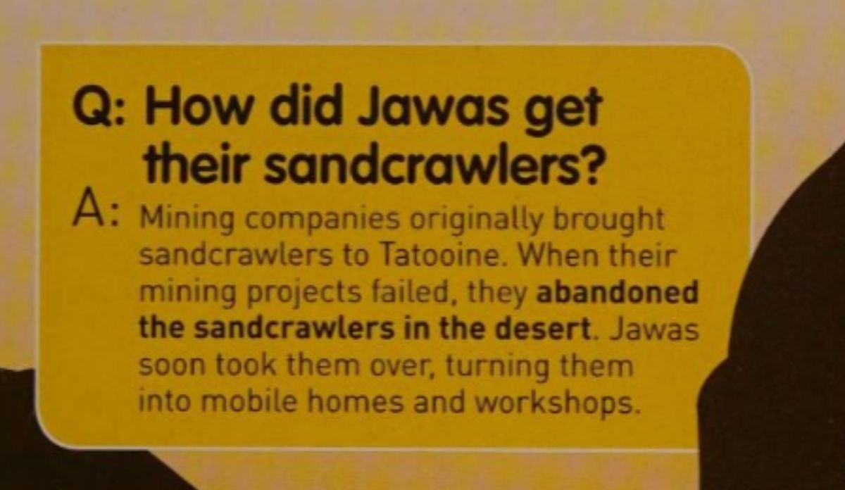 “Mining companies originally brought Sandcrawlers to Tatooine. When their mining projects failed, they abandoned the Sandcrawlers in the desert. Jawas soon took them over, turning them into mobile homes and workshops.”