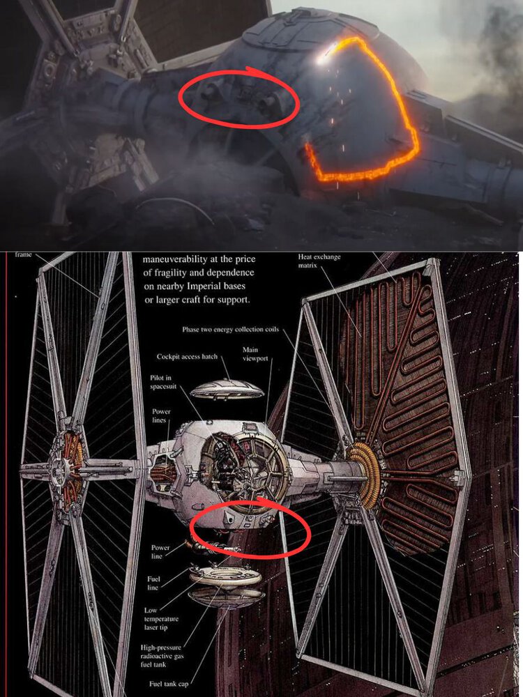 There’s another detail that backs this up: the fuel tank cap seen in cross-section diagrams of the TIE. If you compare it to the scene, you can spot a similar shape near where Gideon emerges, confirming that he’s cutting through the lower section of the hull, not the top hatch.