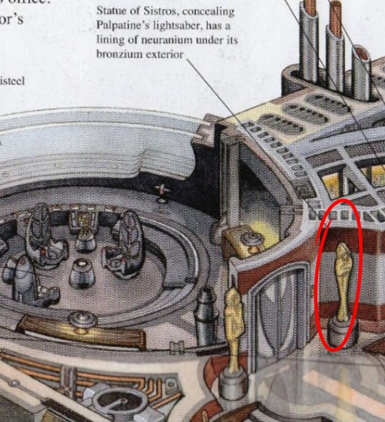 When the Jedi walk in, Palpatine only has one lightsaber actually tucked up his sleeve. To understand why, you have to look at where the duel takes place and where his weapons are stashed. Official cutaway art of his office shows that his other lightsaber is concealed inside one of the Sith statues, built into the room as a hiding place that also helps mask it from security scans. That statue is positioned at the front of the office, away from the window and the ledge where the duel ends up.