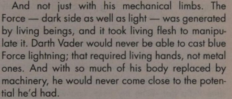 “The Force—dark side as well as light—was generated by living beings, and it took living flesh to manipulate it. Darth Vader would never be able to cast blue Force lightning; that required living hands, not metal ones.”