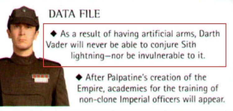 “As a result of having artificial arms, Darth Vader will never be able to conjure Sith lightning—nor be invulnerable to it.”