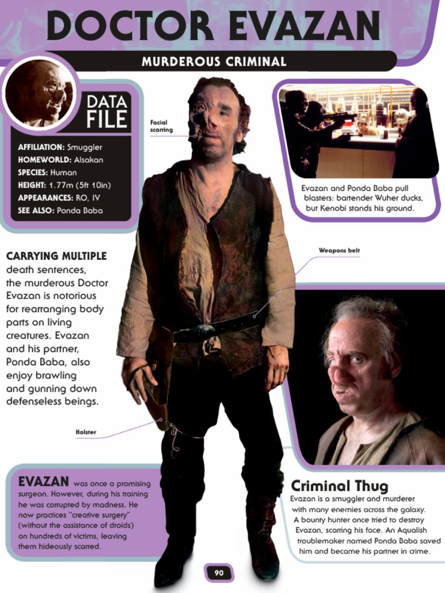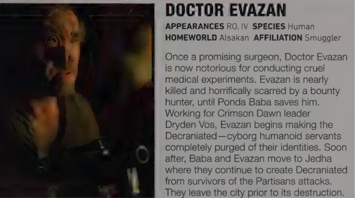 An ISB agent named Andressa Divo opens an investigation into him, gathering details from his time working for Vos. She even gets hold of a security image showing Evazan operating on a Decraniated, with Ponda Baba assisting. In her notes, Divo describes what Evazan did as a nightmare, something she considers worse than slavery.