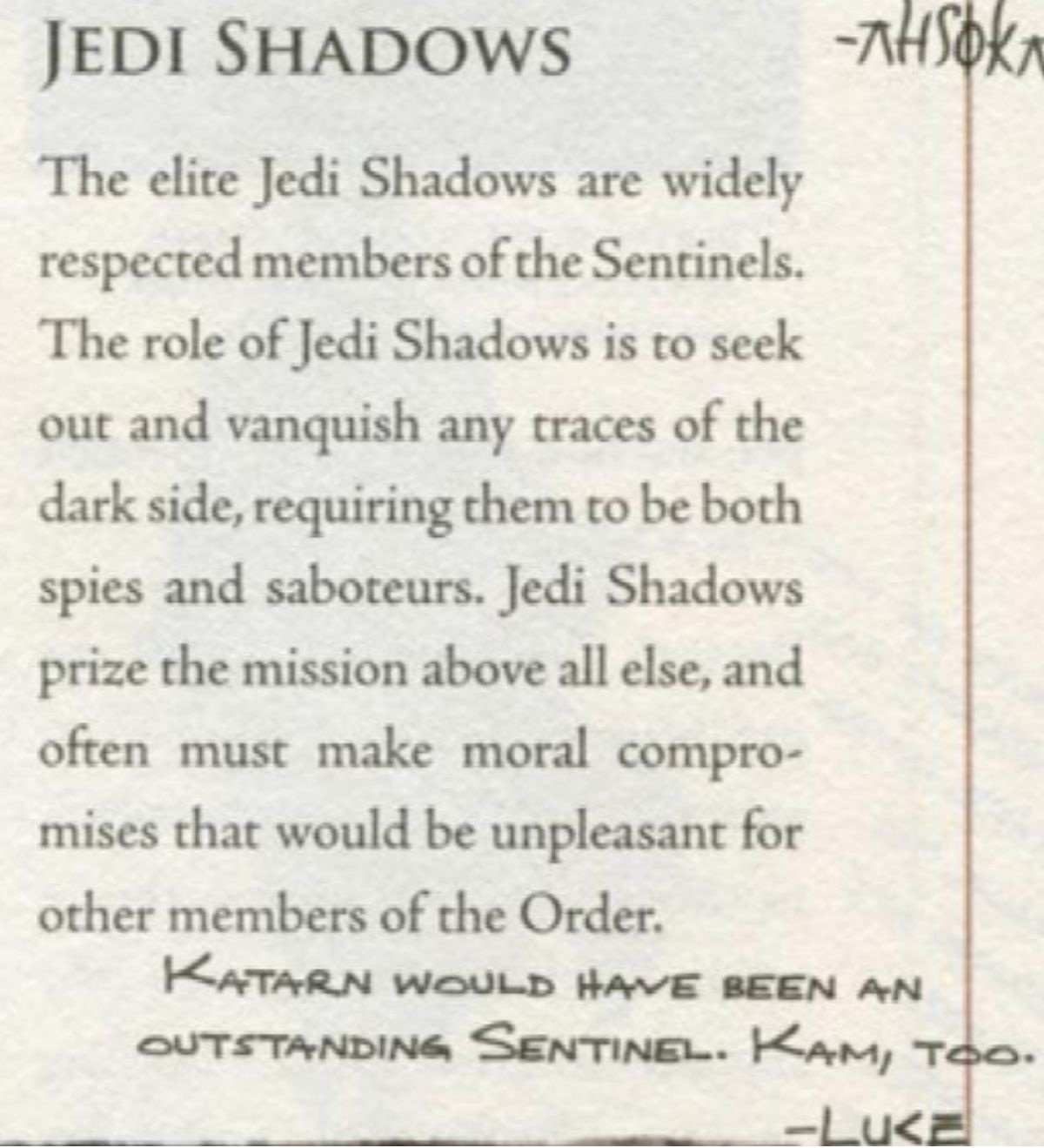 In The Jedi Path, the Sentinel path branches into specialties like Slicer, Tech Expert, Security Expert, and Jedi Shadow. And the title that really explains the fear factor is the Jedi Shadow. The book describes their job in blunt terms: “The role of Jedi Shadows is to seek out and vanquish any traces of the dark side…”