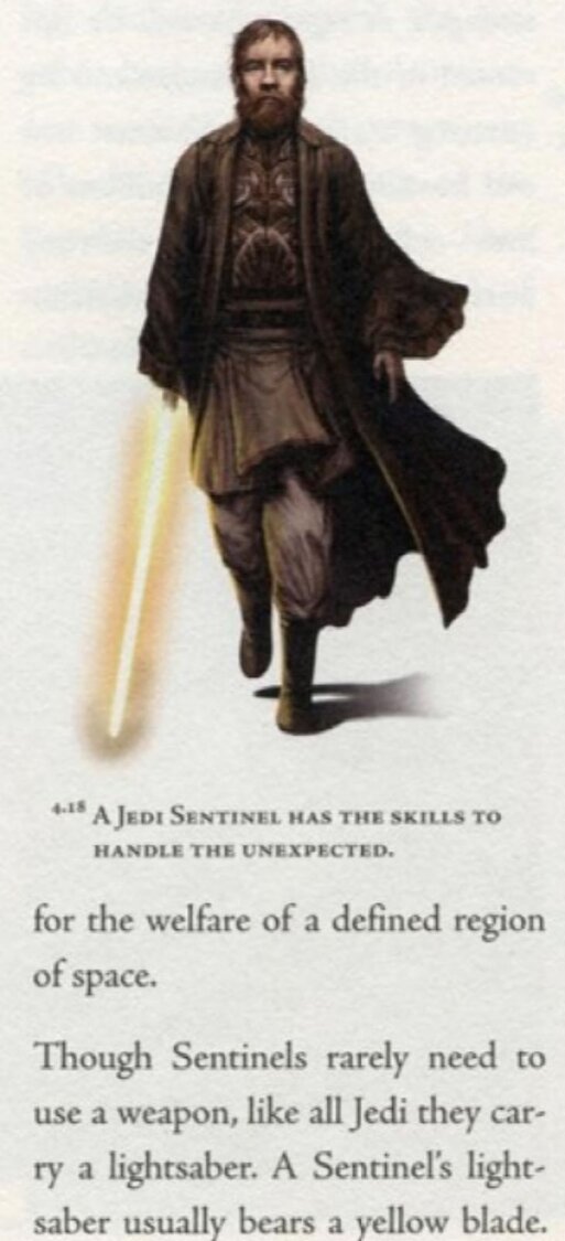 In Legends, the cleanest place this idea shows up is the Knights of the Old Republic era. When the game explains Jedi “paths,” yellow is directly tied to the Jedi Sentinel—the middle-ground branch between the Guardian and the Consular. And The Jedi Path backs up the same association in plain language, noting that while Sentinels rarely need to draw a weapon, they still carry one like any Jedi—and “a Sentinel’s lightsaber usually bears a yellow blade.”