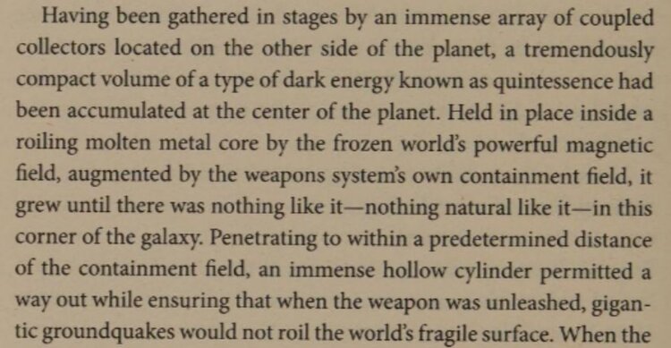 “Having been gathered in stages by an immense array of coupled collectors located on the other side of the planet, a tremendously compact volume of a type of dark energy known as quintessence had been accumulated at the center of the planet.”