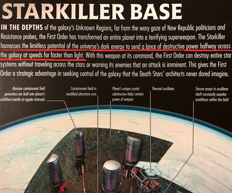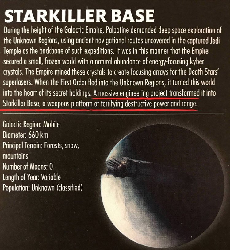 “A massive engineering project transformed it into Starkiller Base, a weapons platform of terrifying destructive power and range.”